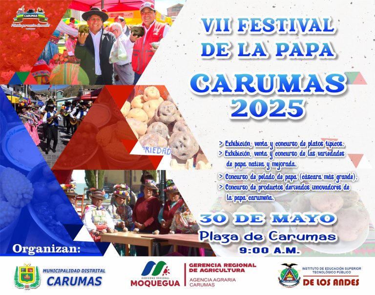 VII FESTIVAL DE LA PAPA ¡Queridos amigos del Distrito de Carumas! ¡Es con gran emoción que les extendemos una cordial invitación al Festival de la Papa 2025!. Este evento anual es una celebración de nuestra rica cultura agrícola y de…