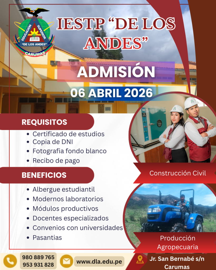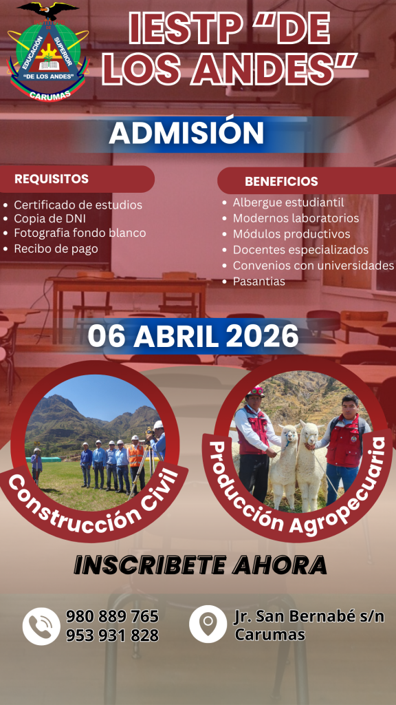 Admisión 2026 𝐄𝐱𝐚𝐦𝐞𝐧 𝐝𝐞 𝐚𝐝𝐦𝐢𝐬𝐢𝐨́𝐧: 𝟎𝟔 𝐝𝐞 𝐚𝐛𝐫𝐢𝐥 𝐝𝐞 𝟐𝟎𝟐𝟔Postula al 𝙄𝙀𝙎𝙏𝙋 ❞𝘿𝙚 𝙇𝙤𝙨 𝘼𝙣𝙙𝙚𝙨❞ – 𝘾𝙖𝙧𝙪𝙢𝙖𝙨 da el primer paso hacia una carrera profesional.𝐏𝐫𝐨𝐠𝐫𝐚𝐦𝐚𝐬 𝐝𝐞 𝐞𝐬𝐭𝐮𝐝𝐢𝐨𝐬: 𝖢𝗈𝗇𝗌𝗍𝗋𝗎𝖼𝖼𝗂𝗈́𝗇 𝖢𝗂𝗏𝗂𝗅 𝖯𝗋𝗈𝖽𝗎𝖼𝖼𝗂𝗈́𝗇 𝖠𝗀𝗋𝗈𝗉𝖾𝖼𝗎𝖺𝗋𝗂𝖺 𝐑𝐞𝐪𝐮𝐢𝐬𝐢𝐭𝐨𝐬:• 𝖢𝖾𝗋𝗍𝗂𝖿𝗂𝖼𝖺𝖽𝗈 𝖽𝖾 𝖾𝗌𝗍𝗎𝖽𝗂𝗈𝗌 • 𝖢𝗈𝗉𝗂𝖺 𝖽𝖾 𝖣𝖭𝖨• 𝖥𝗈𝗍𝗈𝗀𝗋𝖺𝖿𝗂́𝖺 𝖿𝗈𝗇𝖽𝗈 𝖻𝗅𝖺𝗇𝖼𝗈 • 𝖱𝖾𝖼𝗂𝖻𝗈 𝖽𝖾 𝗉𝖺𝗀𝗈 𝐁𝐞𝐧𝐞𝐟𝐢𝐜𝐢𝐨𝐬: 𝖠𝗅𝖻𝖾𝗋𝗀𝗎𝖾 𝖾𝗌𝗍𝗎𝖽𝗂𝖺𝗇𝗍𝗂𝗅 𝖫𝖺𝖻𝗈𝗋𝖺𝗍𝗈𝗋𝗂𝗈𝗌 𝗆𝗈𝖽𝖾𝗋𝗇𝗈𝗌 𝖬𝗈́𝖽𝗎𝗅𝗈𝗌 𝗉𝗋𝗈𝖽𝗎𝖼𝗍𝗂𝗏𝗈𝗌 𝖣𝗈𝖼𝖾𝗇𝗍𝖾𝗌 𝖾𝗌𝗉𝖾𝖼𝗂𝖺𝗅𝗂𝗓𝖺𝖽𝗈𝗌 𝖢𝗈𝗇𝗏𝖾𝗇𝗂𝗈𝗌 𝗎𝗇𝗂𝗏𝖾𝗋𝗌𝗂𝗍𝖺𝗋𝗂𝗈𝗌 𝖯𝖺𝗌𝖺𝗇𝗍𝗂́𝖺𝗌 𝖨𝗇𝖿𝗈𝗋𝗆𝖾𝗌: 𝟫𝟪𝟢 𝟪𝟪𝟫 𝟩𝟨𝟧 / 𝟫𝟧𝟥 𝟫𝟥𝟣 𝟪𝟤𝟪 𝗐𝗐𝗐.𝖽𝗅𝖺.𝖾𝖽𝗎.𝗉𝖾 ¡𝐍𝐨 𝐝𝐞𝐣𝐞𝐬 𝐩𝐚𝐬𝐚𝐫 𝐞𝐬𝐭𝐚 𝐨𝐩𝐨𝐫𝐭𝐮𝐧𝐢𝐝𝐚𝐝 𝐈𝐧𝐬𝐜𝐫𝐢́𝐛𝐞𝐭𝐞 𝐚𝐡𝐨𝐫𝐚 𝐲 𝐚𝐬𝐞𝐠𝐮𝐫𝐚 𝐭𝐮 𝐟𝐮𝐭𝐮𝐫𝐨. Reglamento de Admisión Ver